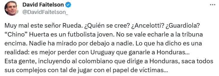 “Muy mal este señor Rueda. ¿Quién se cree? ¿Ancelotti? ¿Guardiola? ”Chino” Huerta es un futbolista joven. No se vale echarle a la tribuna encima. Nadie ha mirado por debajo a nadie. Lo que ha dicho es una realidad: es mejor perder con Uruguay que ganarle a Honduras”, escribió David Faitelson en su cuenta de X.