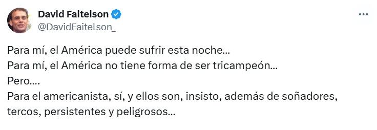 “Para mí, el América puede sufrir esta noche… Para mí, el América no tiene forma de ser tricampeón… Pero…. Para el americanista, sí, y ellos son, insisto, además de soñadores, tercos, persistentes y peligrosos”, escribió David Faitelson en su cuenta de X.