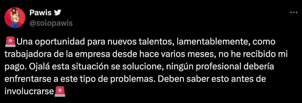 “Una oportunidad para nuevos talentos, lamentablemente, como trabajadora de la empresa desde hace varios meses, no he recibido mi pago. Ojalá esta situación se solucione, ningún profesional debería enfrentarse a este tipo de problemas. Deben saber esto antes de involucrarse”, escribió la periodista Paulina Trejo, actual colaboradora de Récord.
