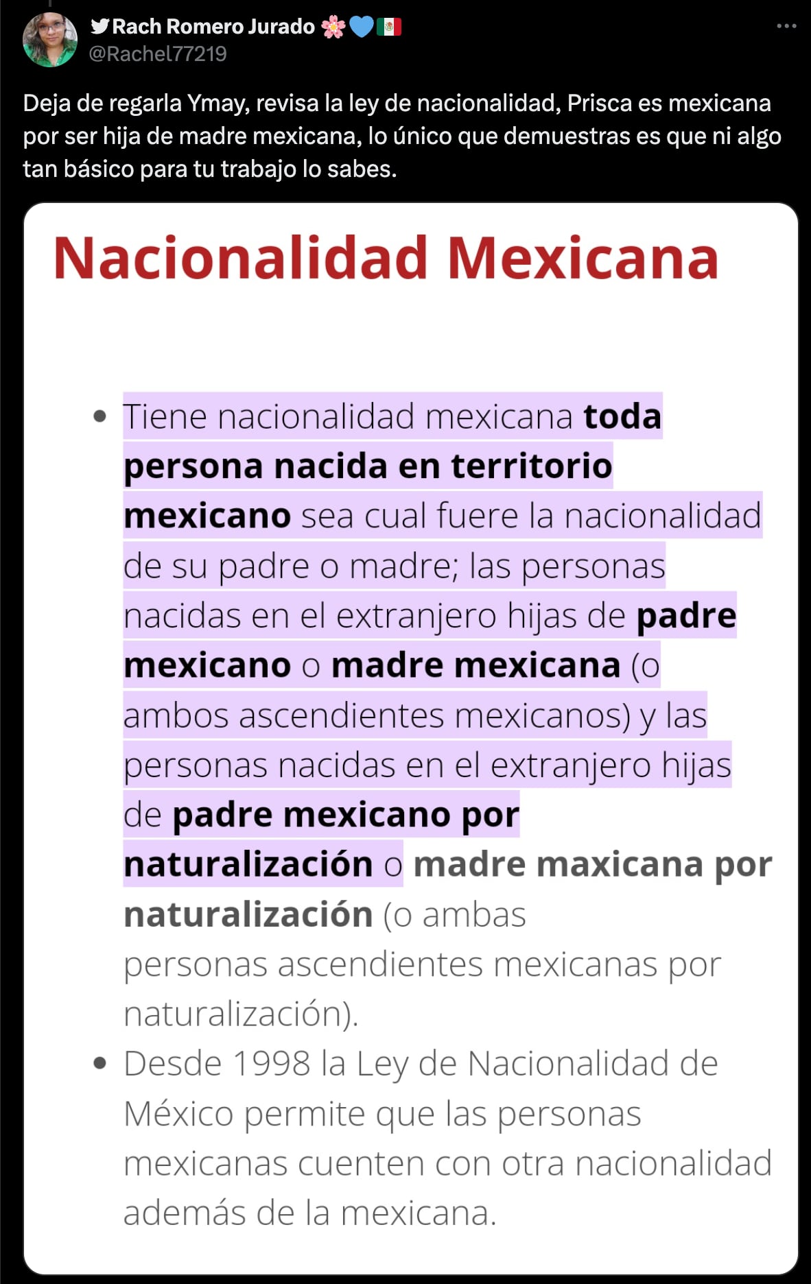 Prisca Awiti Alcaraz nació en Londres en 1996, sin embargo, su madre es de México, por lo que de acuerdo a las leyes de nuestro país, es mexicana por nacimiento, no es naturalizada.
