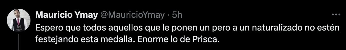 “Espero que todos aquellos que le ponen un pero a un naturalizado no estén festejando esta medalla. Enorme lo de Prisca”, escribió el comentarista de ESPN en sus redes sociales.