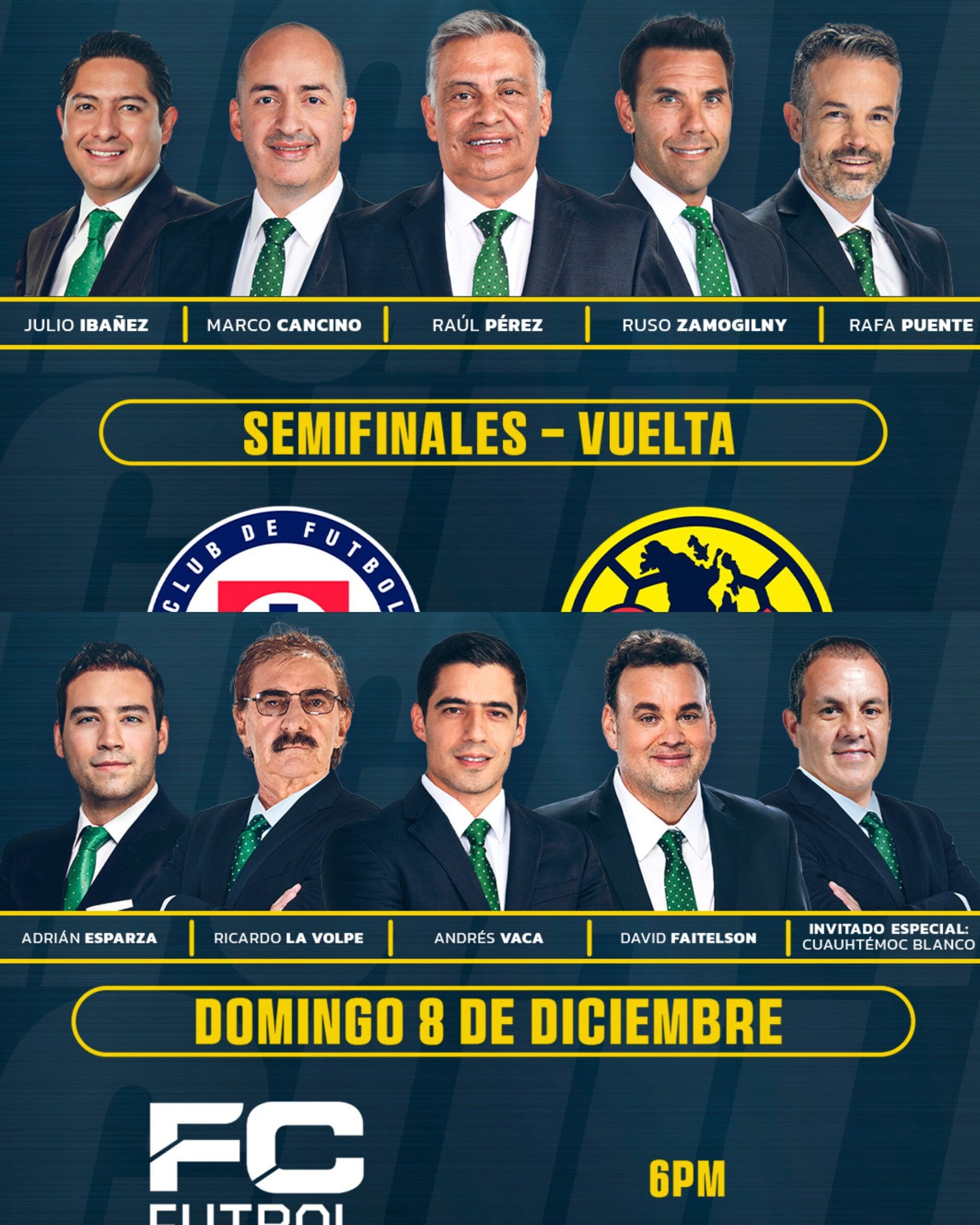 La primera transmisión para el Cruz Azul vs América estará a cargo de Andrés Vaca, David Faitelson, Ricardo La Volpe, Cuauhtémoc Blanco y Adrián Esparza Oteo, en Canal 5 y TUDN.