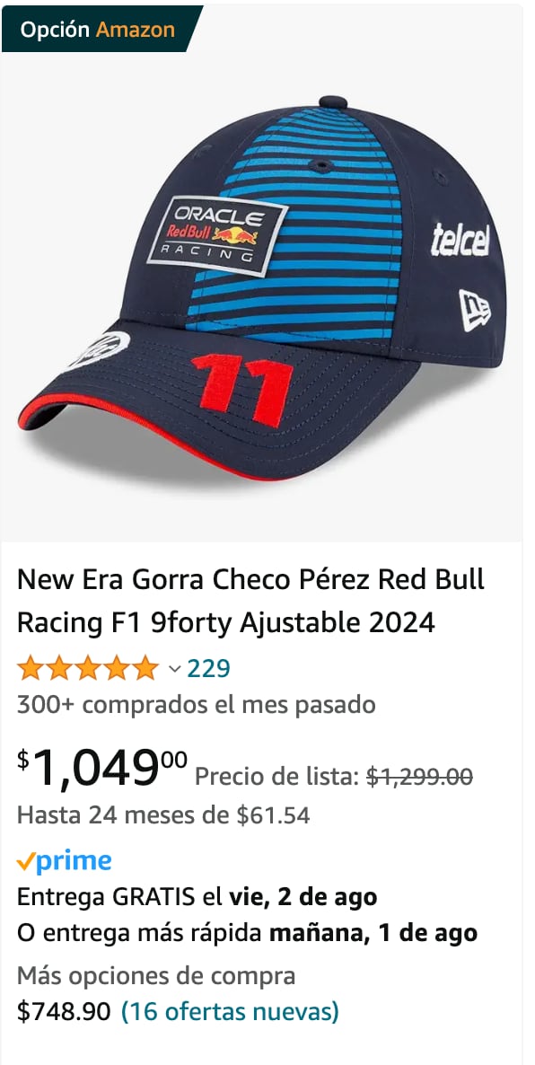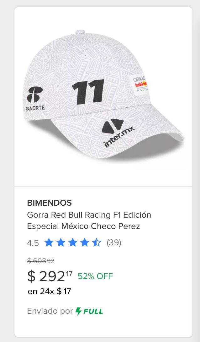 En la página de Mercado Libre podrás encontrar a un buen precio las gorras de Checo Pérez, pues la más económica está en un precio de 292 pesos.