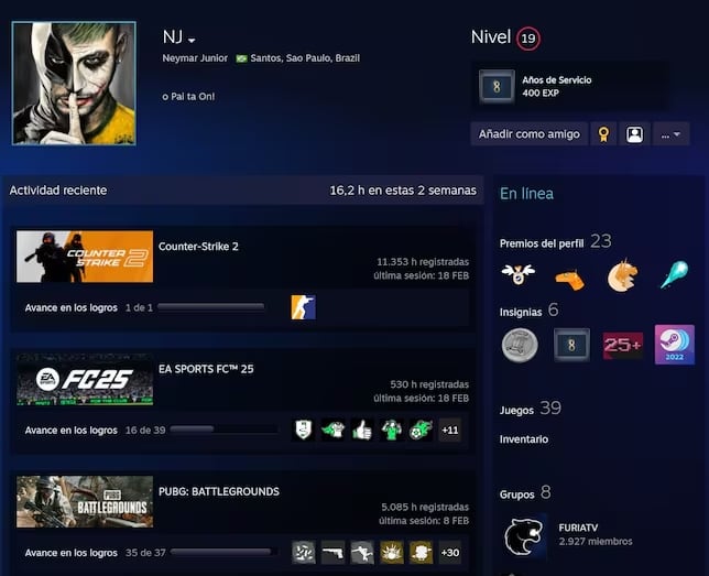 Según el perfil de jugador de Neymar, son 11 mil 353 horas las que tiene registradas en el juego Counter Strike; sin embargo, también acumula horas en otros juegos como el EA Sports FC 25 (antes FIFA) al cual ha jugado 530 horas y PUBG: Battlegrounds, al cual ha jugado 5 mil 85 horas.