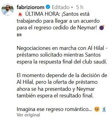 “¡Santos está trabajando para llegar a un acuerdo para el regreso cedido de Neymar! Negociaciones en marcha con Al Hilal. Préstamo solicitado mientras Santos espera la respuesta final del club saudí”, escribió Fabrizio Romano.