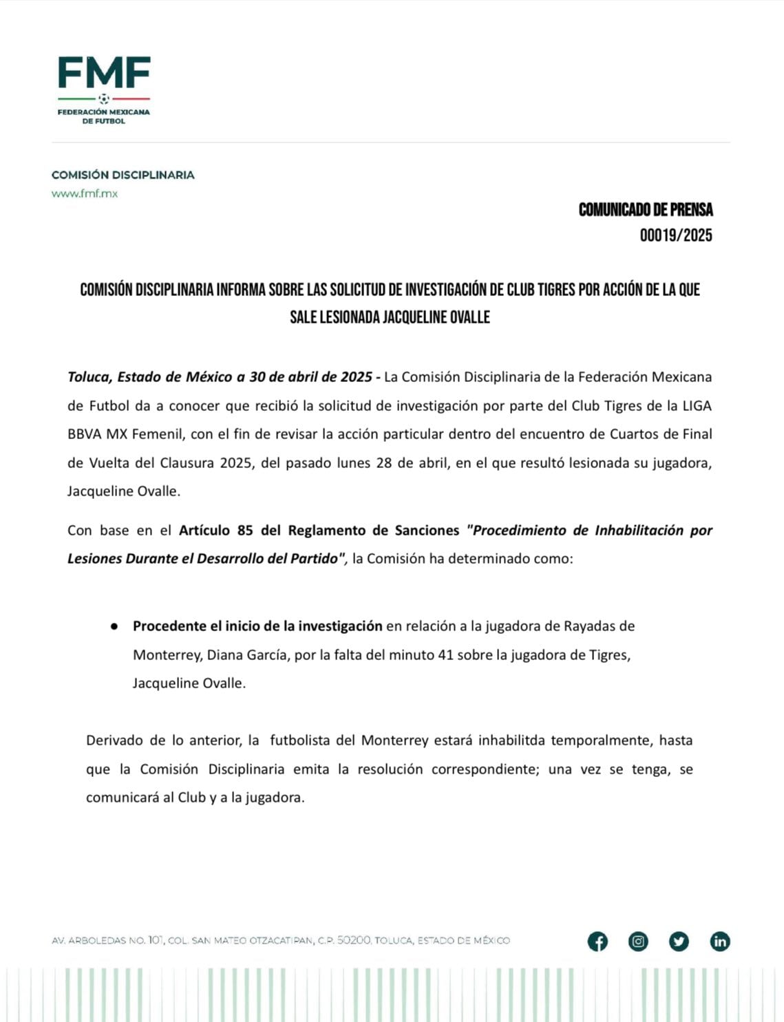 “Procedió el inicio de la investigación en relación con la jugadora de Rayadas de Monterrey, Diana García, por la falta del minuto 41 sobre la jugadora de Tigres, Jacqueline Ovalle, se lee en el comunicado de la Comisión Disciplinaria.