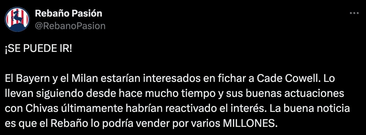 Luego de que se diera a conocer el interés del Bayern Múnich y del Milan por fichar a Cade Cowell, el Club Chivas no ha dado ningún comunicado oficial al respecto.
