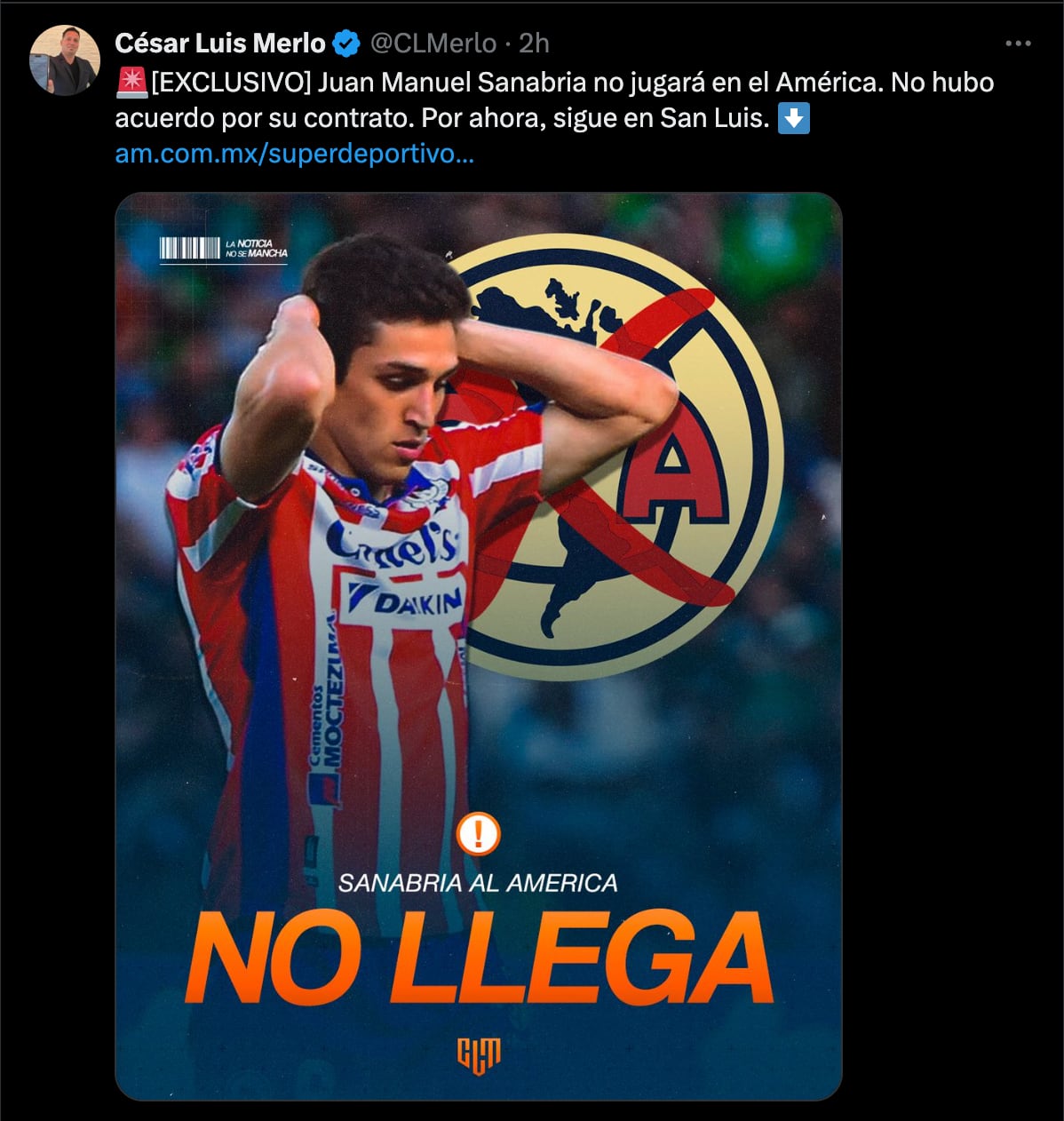 El periodista César Luis Merlo fue quien dio a conocer que América no cerró el acuerdo con Juan Manuel Sanabria y el charrúa ya no sería refuerzo de los Millonetas a pesar de que días atrás ya habían cerrado un acuerdo de palabra, lo que parecía que su arribo a Nido era inminente.