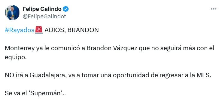 “Monterrey ya le comunicó a Brandon Vázquez que no seguirá más con el equipo. NO irá a Chivas, va a tomar una oportunidad de regresar a la MLS. Se va el ‘Supermán’”, escribió el periodista en su cuenta de X.