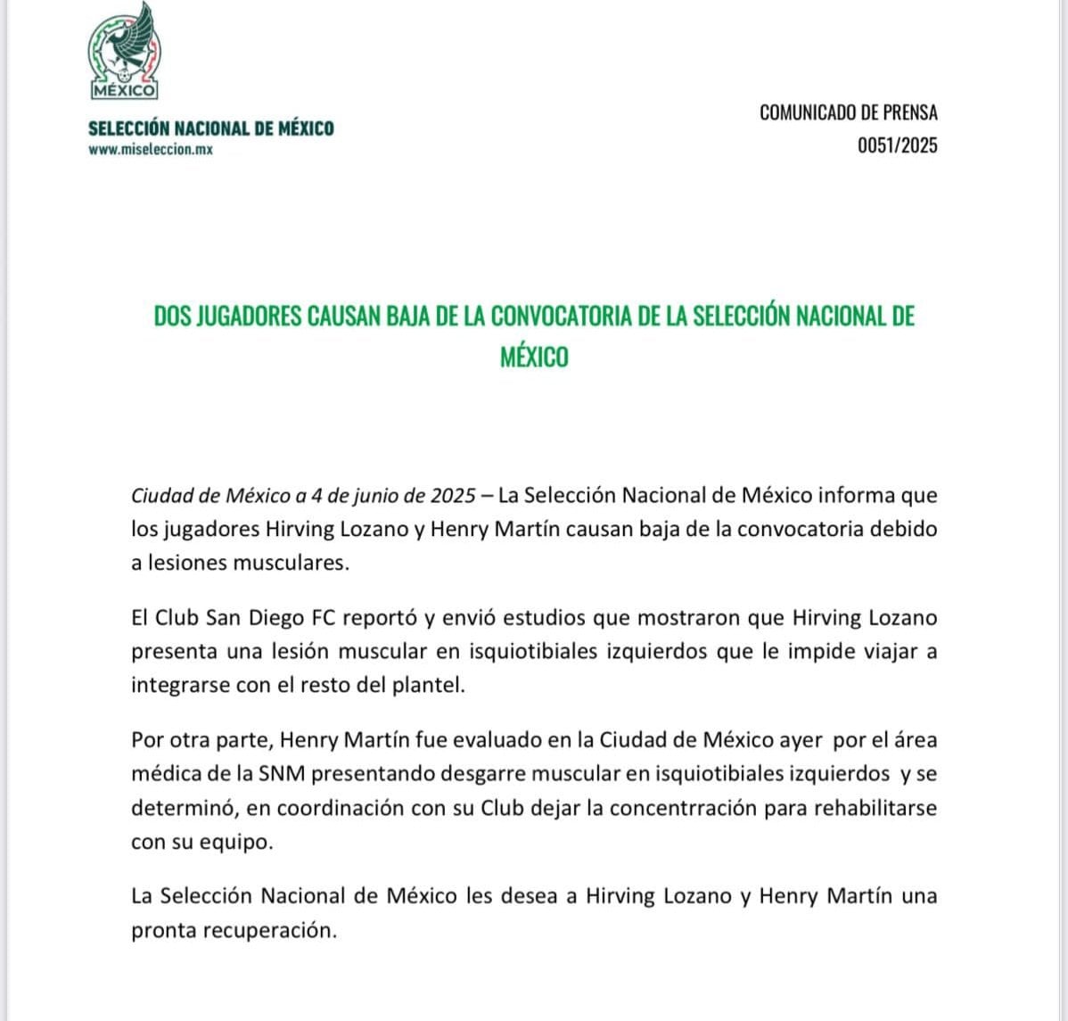 Es importante resaltar que Henry Martín y Chucky Lozano todavía no estaban dentro de la lista definitiva de la Selección Mexicana, por lo que sus bajas generarán huecos que otros jugadores en la prelista tratarán de aprovechar para hacerse con su lugar.