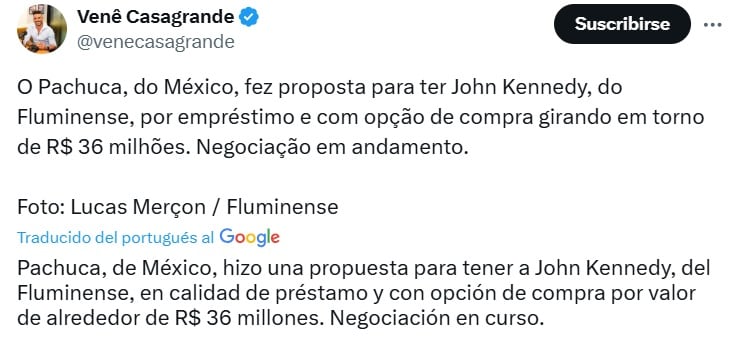 “Pachuca de México hizo una propuesta para tener a John Kennedy, del Fluminense, en calidad de préstamo y con opción de compra por valor de alrededor de R $36 millones. Negociación en curso”, escribió el periodista en su cuenta de X.