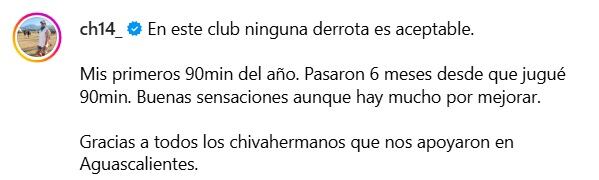 “En este club ninguna derrota es aceptable. Mis primeros 90 minutos del año. Pasaron 6 meses desde que jugué 90 minutos. Buenas sensaciones aunque hay mucho por mejorar. Gracias a todos los chivahermanos que nos apoyaron en Aguascalientes”, escribió Chicharito Hernández en su cuenta de X.