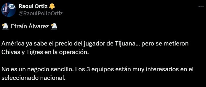 “América ya sabe el precio del jugador de Tijuana... pero se metieron Chivas y Tigres en la operación. No es un negocio sencillo. Los 3 equipos están muy interesados en el seleccionado nacional”, reveló el periodista Raoul Pollo Ortiz.