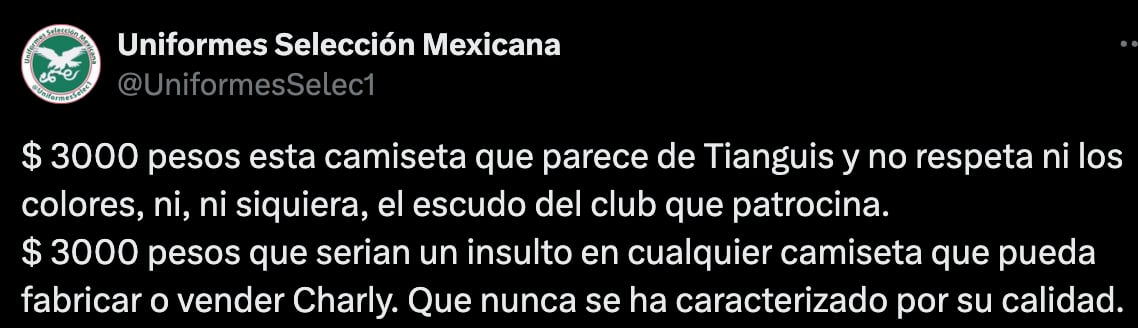 “$3000 pesos esta camiseta que parece de Tianguis y no respeta ni los colores, ni, ni siquiera, el escudo del club que patrocina. $3000 pesos que serían un insulto en cualquier camiseta que pueda fabricar o vender Charly. Que nunca se ha caracterizado por su calidad”, es uno de los comentarios.