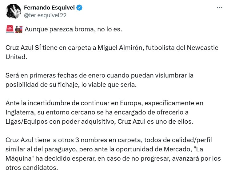 “Cruz Azul SÍ tiene en carpeta a Miguel Almirón, futbolista del Newcastle United. Será en primeras fechas de enero cuando puedan vislumbrar la posibilidad de su fichaje, lo viable que sería”, escribió el periodista en su cuenta de X.