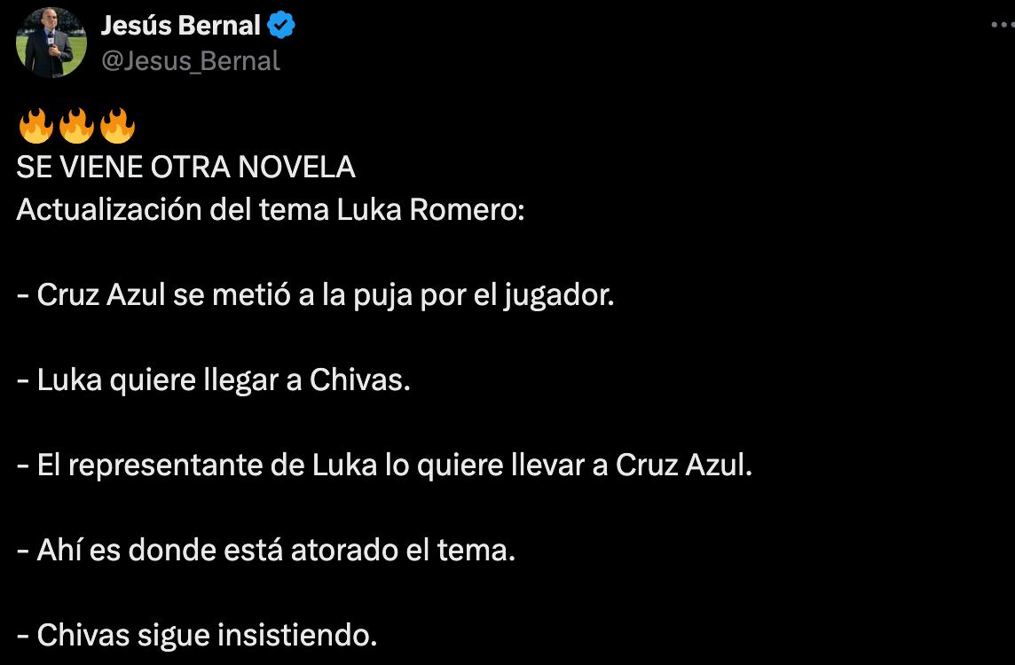 “Cruz Azul se metió a la puja por el jugador. Luka quiere llegar a Chivas. El representante de Luka lo quiere llevar a Cruz Azul. Ahí es donde está atorado el tema. Chivas sigue insistiendo”, escribió el periodista en su cuenta de X.