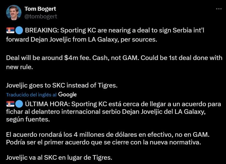 “Sporting KC está cerca de llegar a un acuerdo para fichar al delantero internacional serbio Dejan Joveljic del LA Galaxy, según fuentes. El acuerdo rondará los 4 millones de dólares en efectivo, no en GAM. Podría ser el primer acuerdo que se cierre con la nueva normativa. Joveljic va al SKC en lugar de Tigres”, escribió en su cuenta de X.