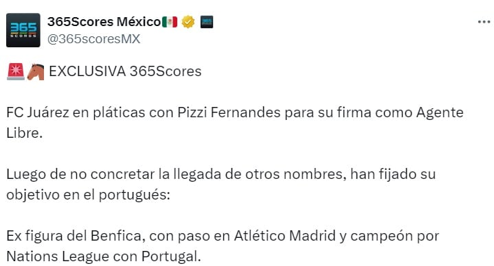 El mismo medio reporta que el interés del equipo de la Liga MX en Pizzi Fernandes se da después que de FC Juárez no pudo concretar otros fichajes.
