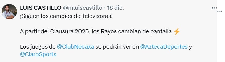 “¡Siguen los cambios de Televisoras! A partir del Clausura 2025, los Rayos cambian de pantalla. Los juegos de Necaxa se podrán ver en TV Azteca Deportes y Claro Video”, escribió el periodista en su cuenta de X.