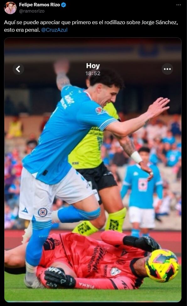 Felipe Ramos Rizo afirmó que el portero del Puebla le tocó primero el pie a Jorge Sánchez y después desvió la trayectoria del balón, por lo que se tenía que marcar penal para el Cruz Azul.