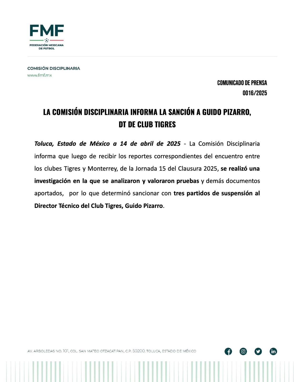 “La Comisión Disciplinaria informa que luego de recibir los reportes correspondientes del encuentro entre los clubes Tigres y Monterrey, de la Jornada 15 del Clausura 2025, se realizó una investigación en la que se analizaron y valoraron pruebas y demás documentos aportados, por lo que determinó sancionar con tres partidos de suspensión al Director Técnico del Club Tigres, Guido Pizarro”.