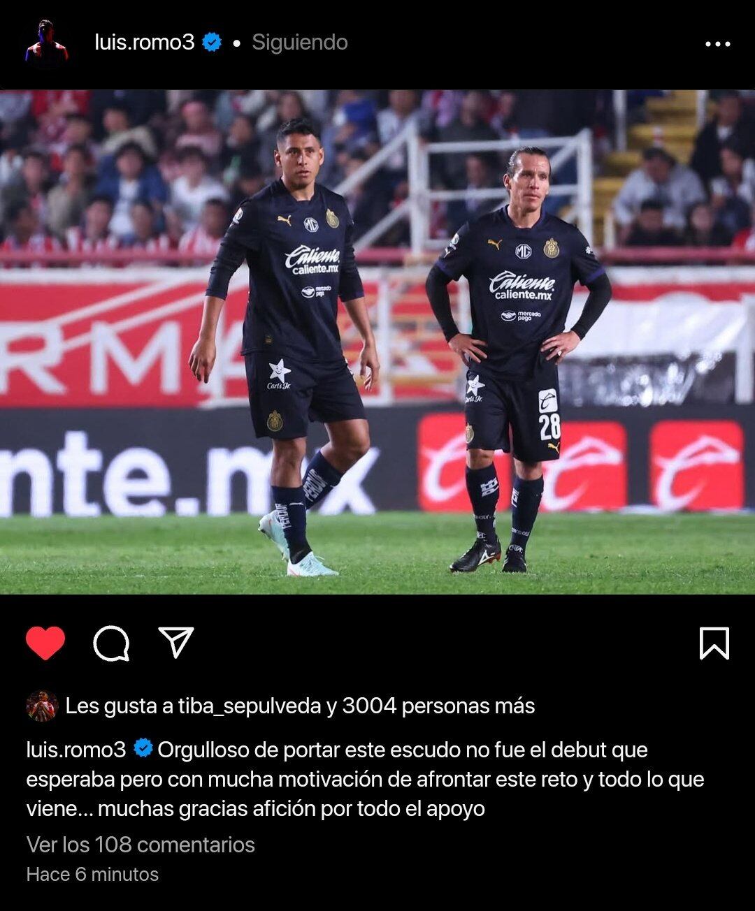 “Orgulloso de portar este escudo. No fue el debut que esperaba, pero con mucha motivación de afrontar este reto y todo lo que viene. Muchas gracias afición por todo el apoyo”, escribió Luis Romo en su cuenta de Instagram tras debutar con Chivas.