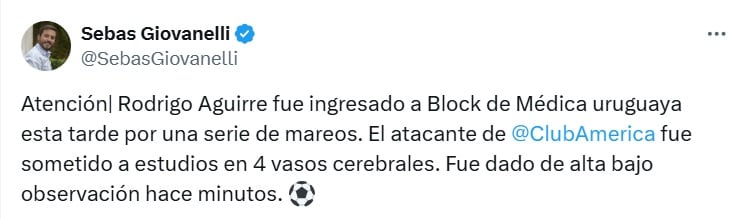 “Atención. Rodrigo Aguirre fue ingresado a Block de Médica uruguaya esta tarde por una serie de mareos. El atacante del América fue sometido a estudios en 4 vasos cerebrales. Fue dado de alta bajo observación hace minutos”, escribió el periodista en su cuenta de X.