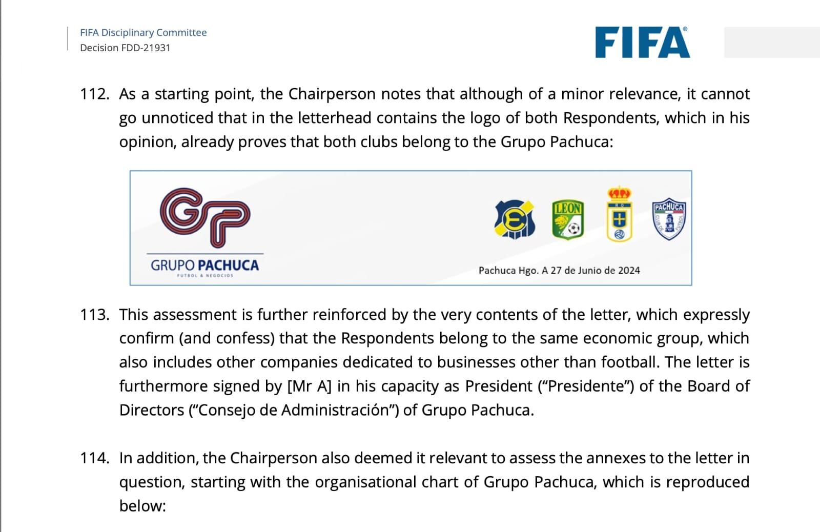 Entre tantos puntos que se establecen, la FIFA menciona que todos los documentos enviados por el Club León para negar la multipropiedad están membretados con los logros del Grupo Pachuca y de sus equipos.
