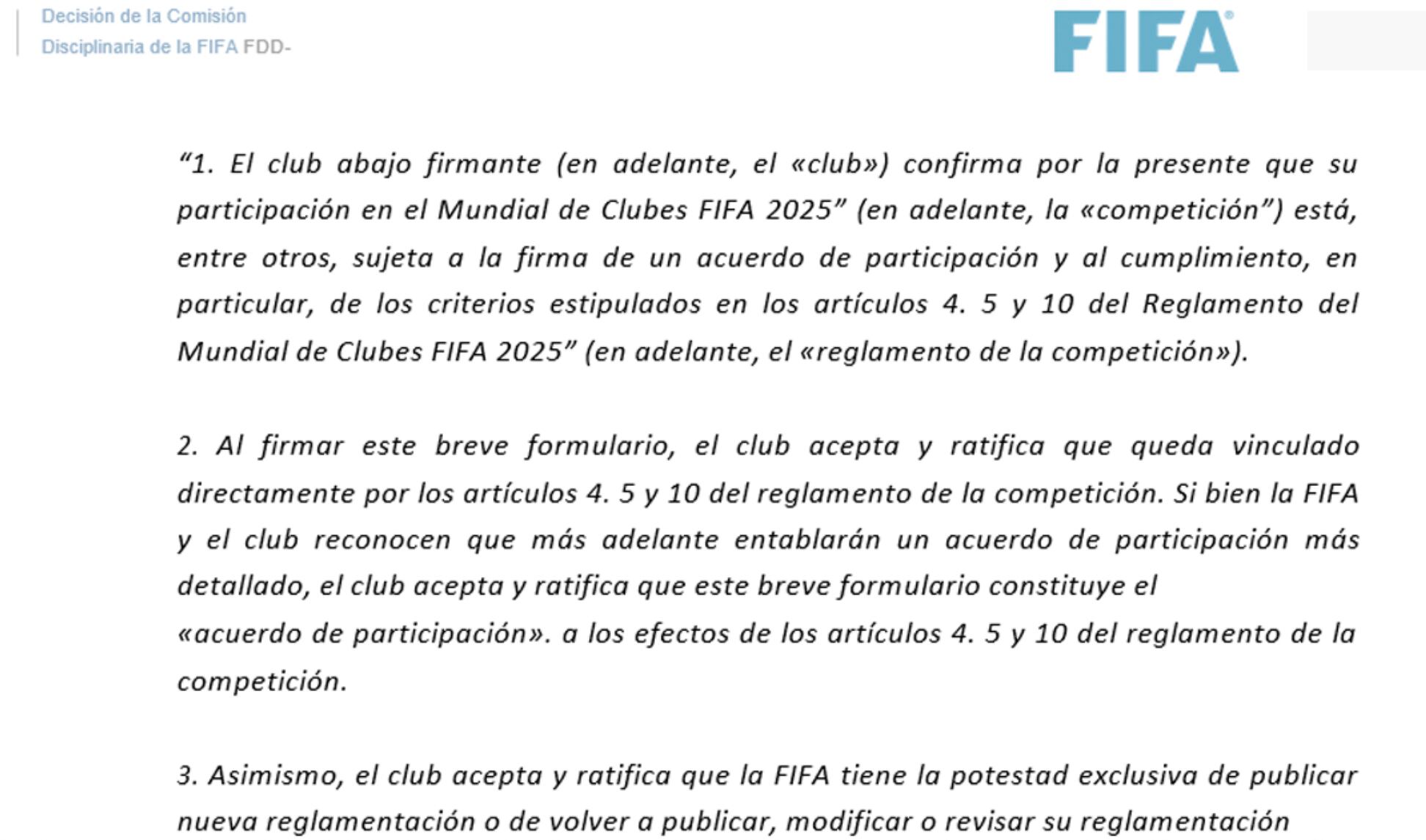En el formulario, la FIFA establece que todos los equipos que participen en el Mundial de Clubes 2025 están obligados a cumplir los artículos 4, 5 y 10 del reglamento de competencia.