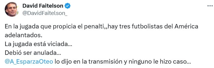 “En la jugada que propicia el penalti, hay tres futbolistas del América adelantados. La jugada está viciada. Debió ser anulada”, escribió David Faitelson en su cuenta de X tras la eliminación de Cruz Azul.