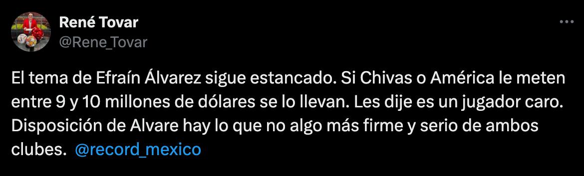 “El tema de Efraín Álvarez sigue estancado. Si Chivas o América le meten entre 9 y 10 millones de dólares se lo llevan. Les dije que es un jugador caro. Disposición de Álvarez hay lo que no algo más firme y serio de ambos clubes”, escribió en su cuenta de X Rene Tovar, colaborador del diario Récord.