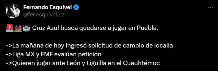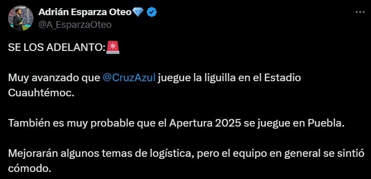 “Se los adelanto: Muy avanzado que Cruz Azul juegue la liguilla en el Estadio Cuauhtémoc. También es muy probable que el Apertura 2025 se juegue en Puebla. Mejorarán algunos temas de logística, pero el equipo en general se sintió cómodo”, escribió el comentarista en su cuenta de X.