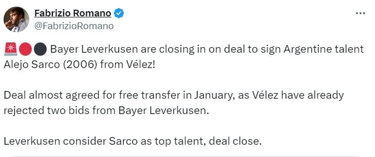 “¡El Bayer Leverkusen se acerca a un acuerdo para fichar al talento argentino Alejo Sarco (2006) procedente de Vélez! El acuerdo de transferencia gratuita estuvo a punto de cerrarse en enero, ya que Vélez ya rechazó dos ofertas del Bayer Leverkusen. El Leverkusen considera a Sarco como el mejor talento, trato cerrado”, escribió en sus redes sociales el insider Fabrizio Romano.
