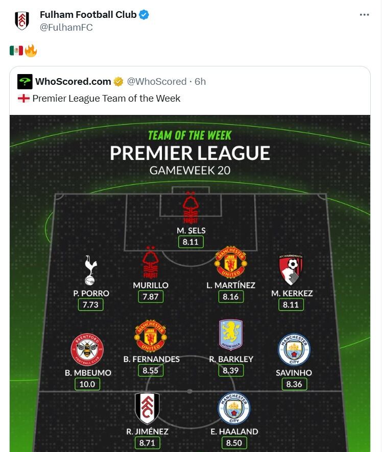 Raúl Jiménez fue incluido en el 11 ideal de la jornada 20 de la Premier League, por lo que el Fulham lo celebró con un emoji de la bandera mexicana y un fuego.