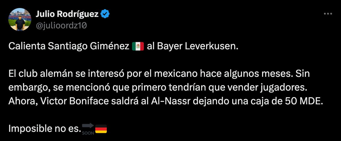 “Calienta Santiago Giménez al Bayer Leverkusen. El club alemán se interesó por el mexicano hace algunos meses. Sin embargo, se mencionó que primero tendrían que vender jugadores. Ahora, Victor Boniface saldrá al Al-Nassr dejando una caja de 50 millones de euros. Imposible no es”, escribió el periodista en su cuenta de X.