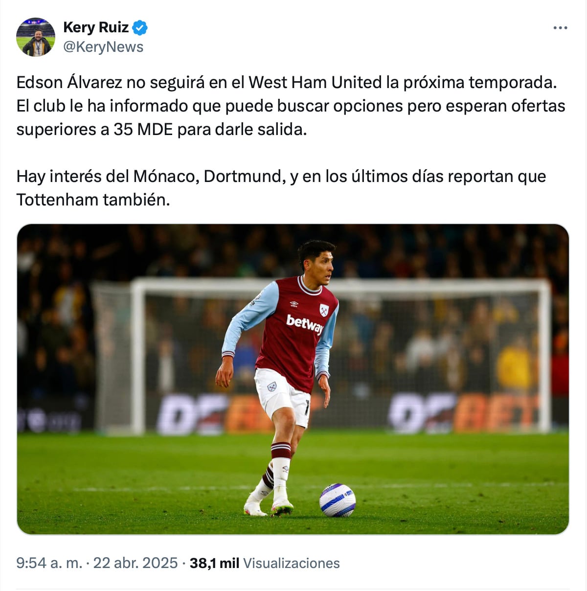 A decir del periodista, Edson Álvarez dejaría West Ham para ir posiblemente a Borussia Dortmund en Alemania, aunque Mónaco en Francia y Tottenham en la misma Premier League también lo contemplarían.